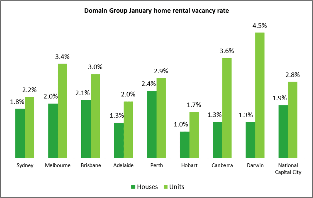 According to Domain Group, vacancy rates for units in the greater Brisbane area were higher for units than houses in January, which is normal across all the capital city markets (see graph below).