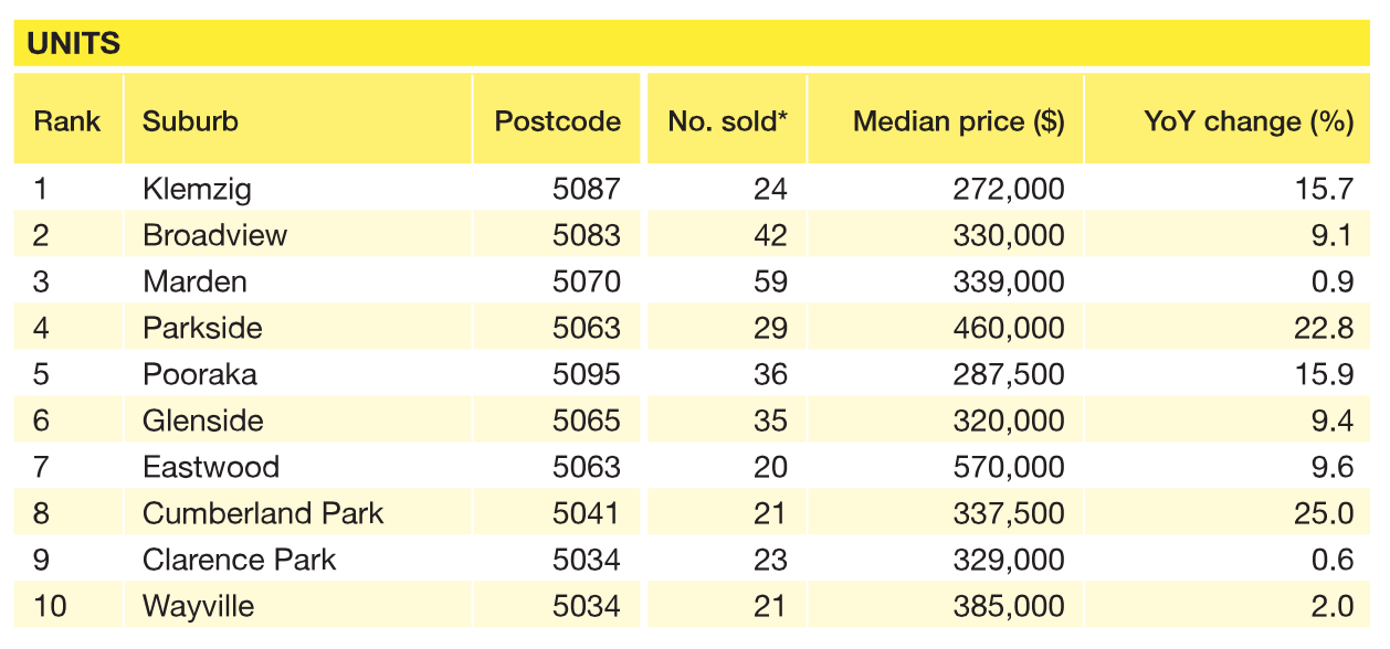 The Smart Investor magazine, published by Fairfax Media, ranked Broadview, Marden and Parkside as Adelaide's top investor suburbs for units.